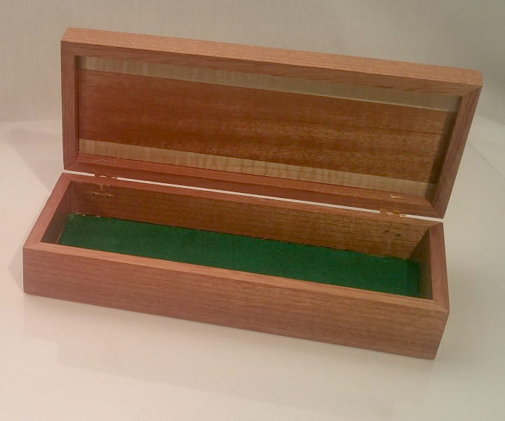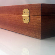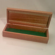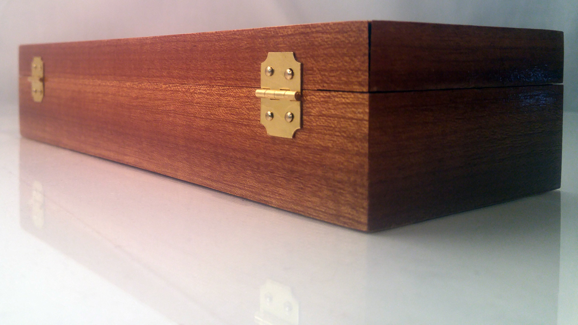 Les essences de bois sont du sapelé (bois africain commun dans la construction de ukulélé) et de l’érable ondé. Fnition extérieure au Shellac de plus de 6 couches. Les plateaux et le fond de la boîte sont couverts de fibre à texture de velours vert qui s’agence parfaitement avec les essences de bois de la boîte.