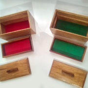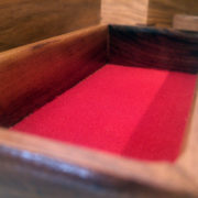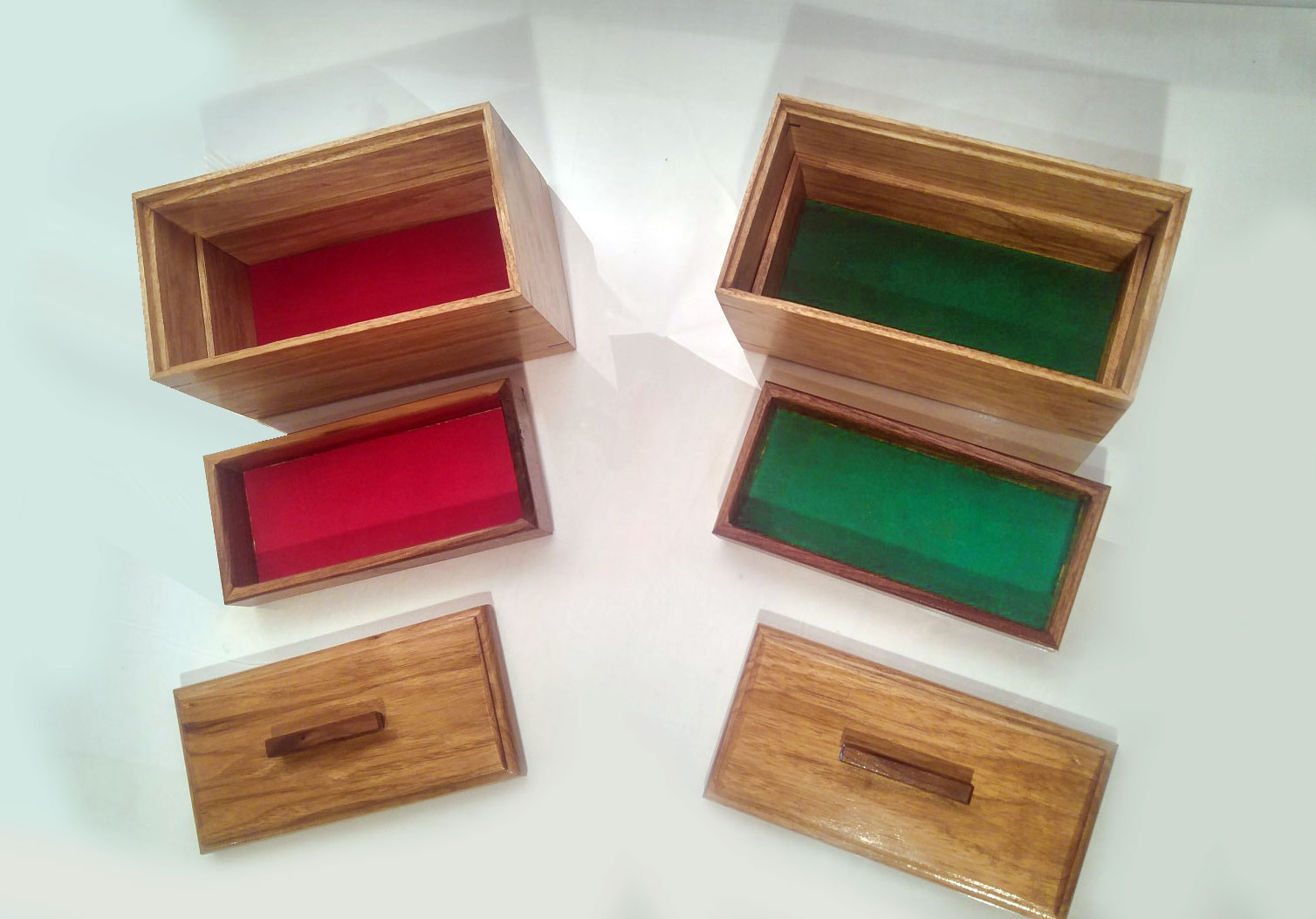 Fond des boîtes recouvert de fibre style velours vert pour l’une et rouge pour l’autre.