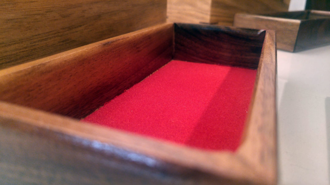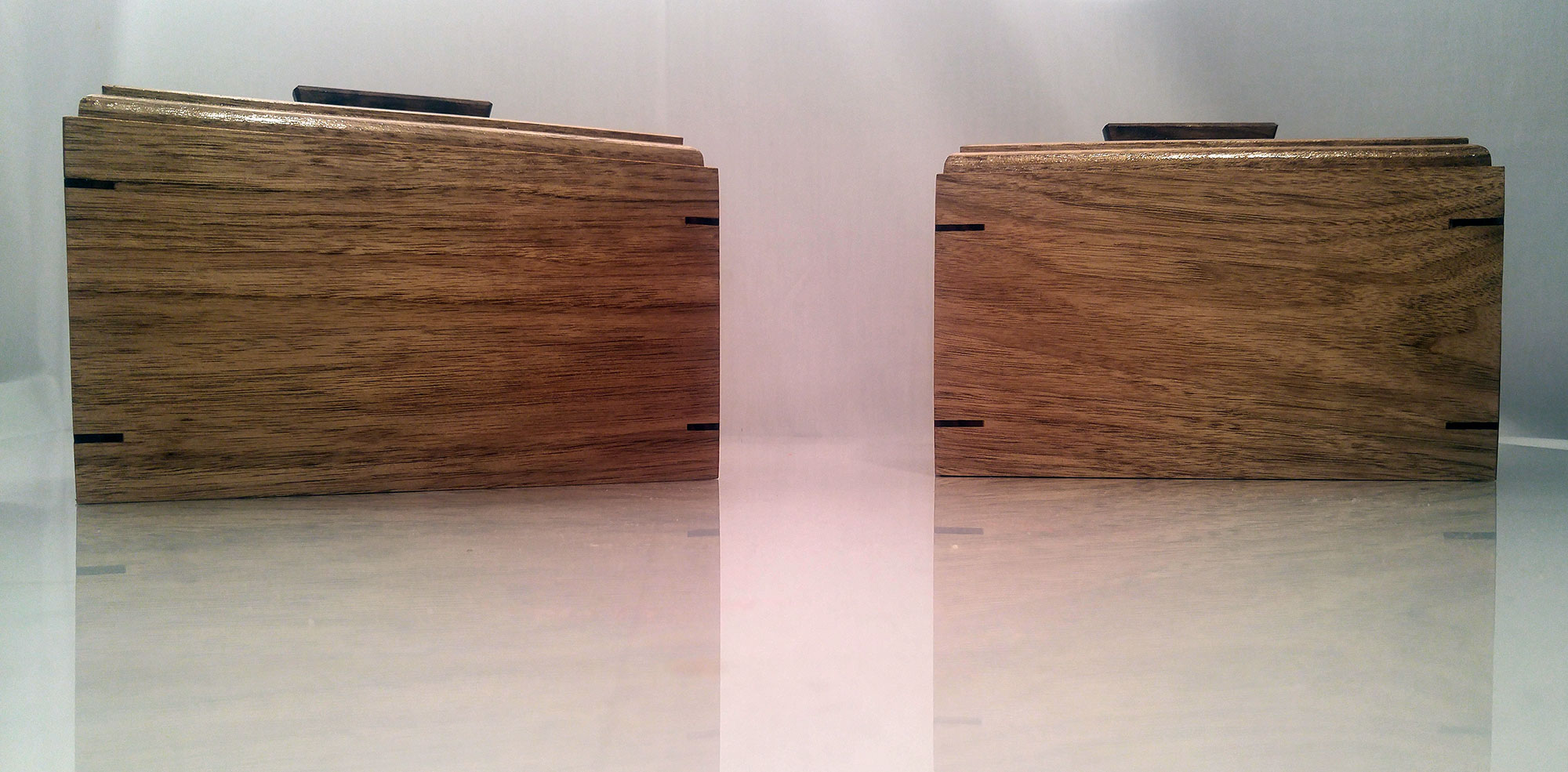 Les boîtes ont chacune un cabaret de noyer noir surélevé pour multiplier l’espace de rangement interne par deux.