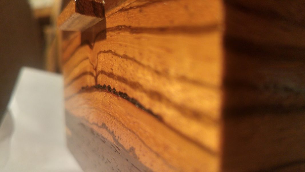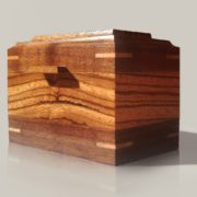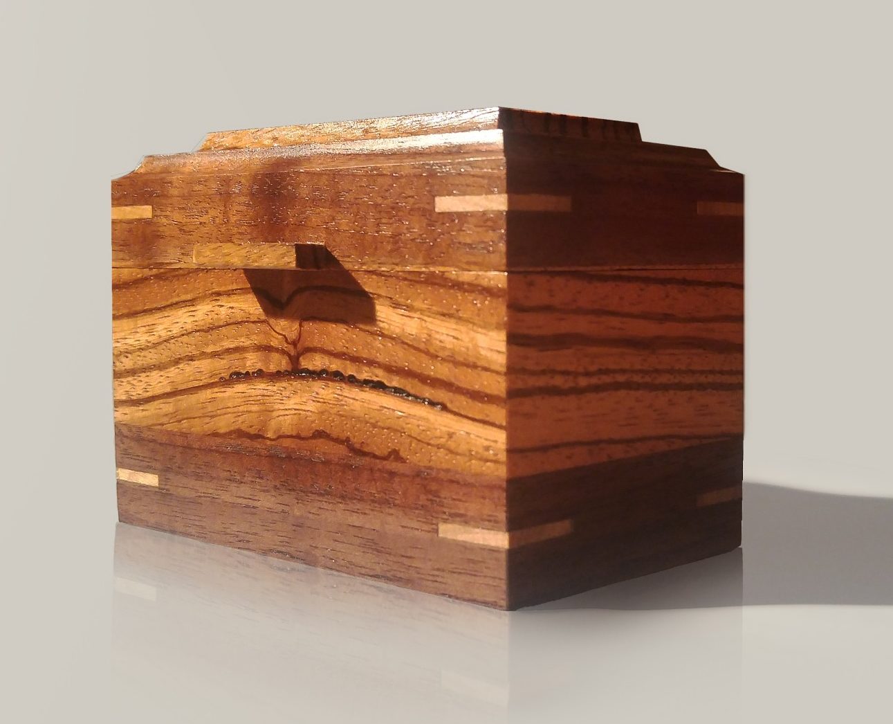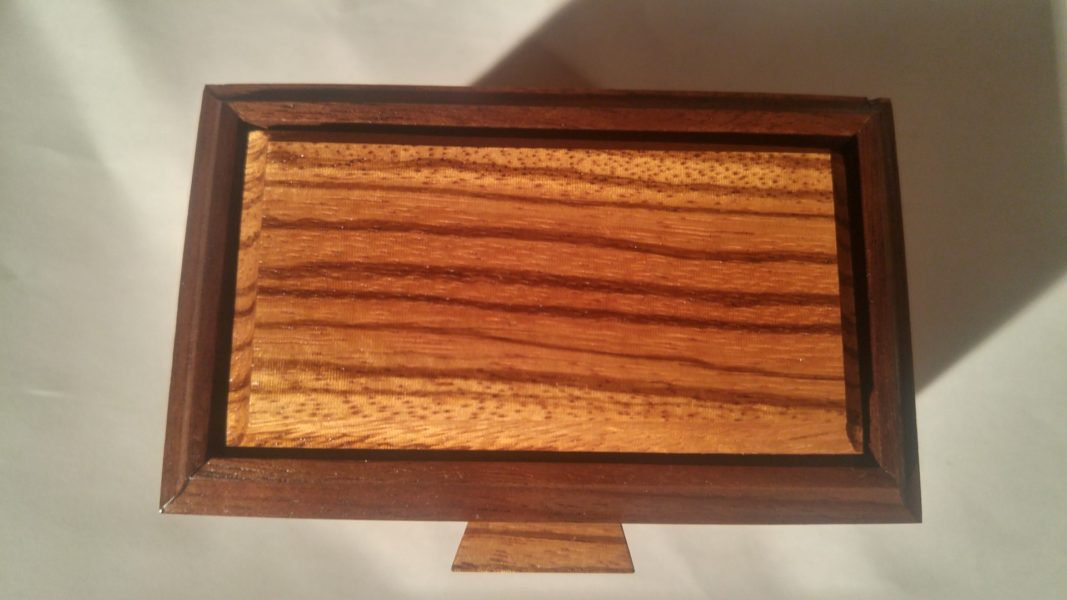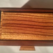 Mini-boîte de rangement pour petits objets. Le zebrano, avec son motif distinctif, s’agence très bien avec le noyer noir. Le fond est recouvert de fibre style velours brun.
